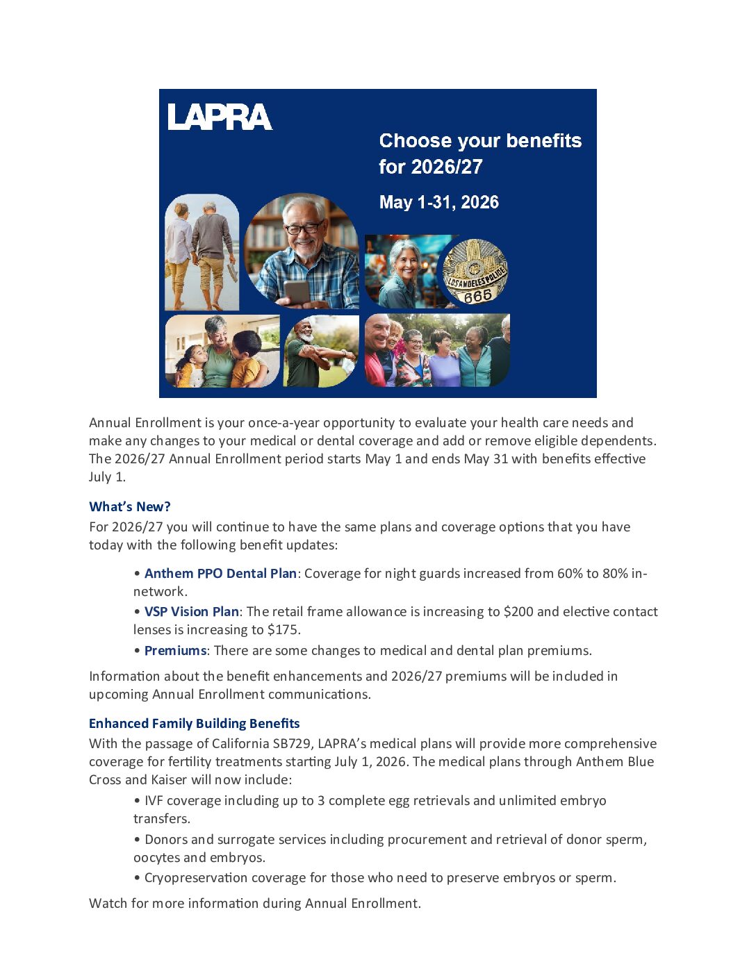 LAPRA Open Enrollment Annual Enrollment is your once-a-year opportunity to [...]