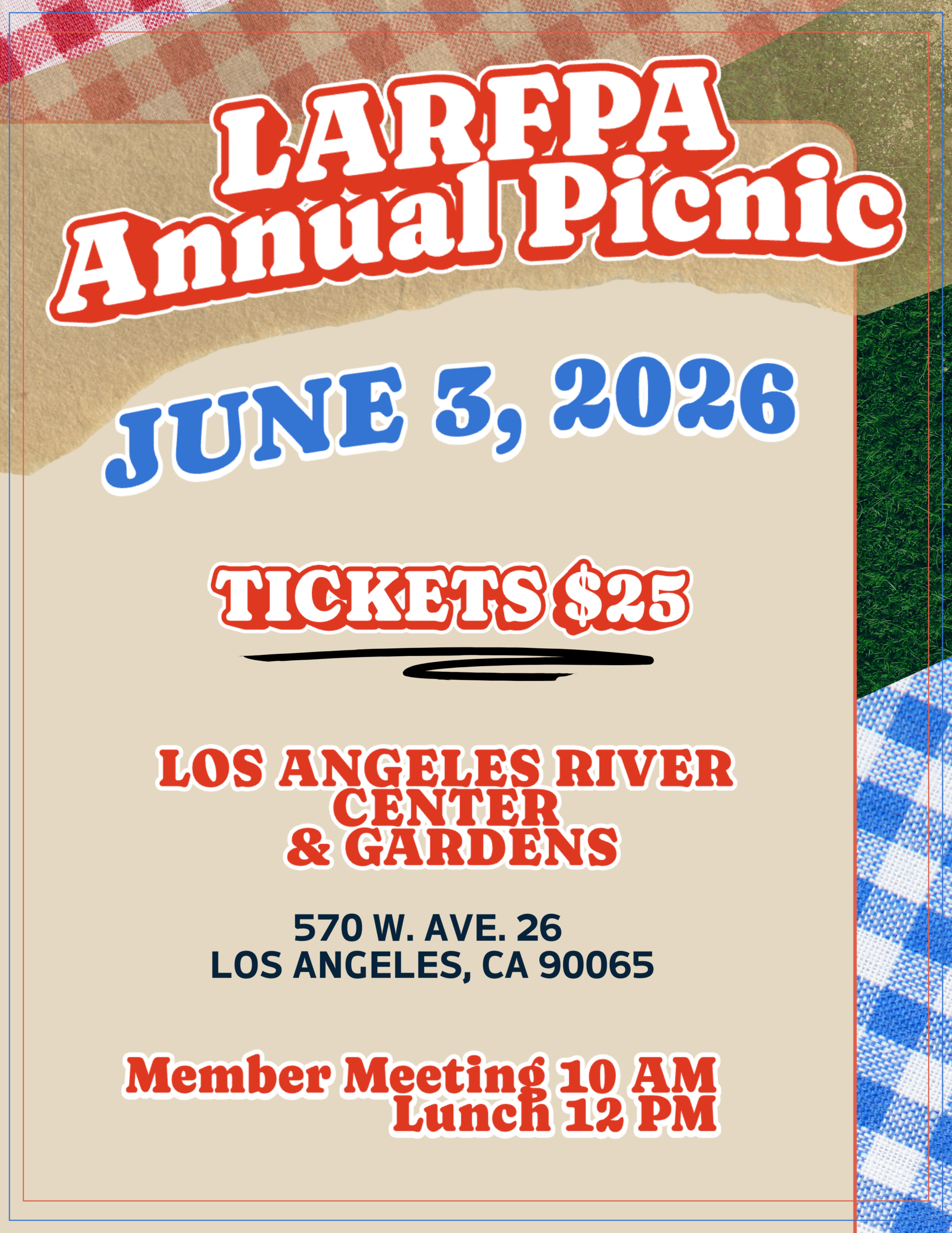 Join us for our LARFPA Annual Picnic on June 3, 2026, at the Los Angeles River Center & Gardens!